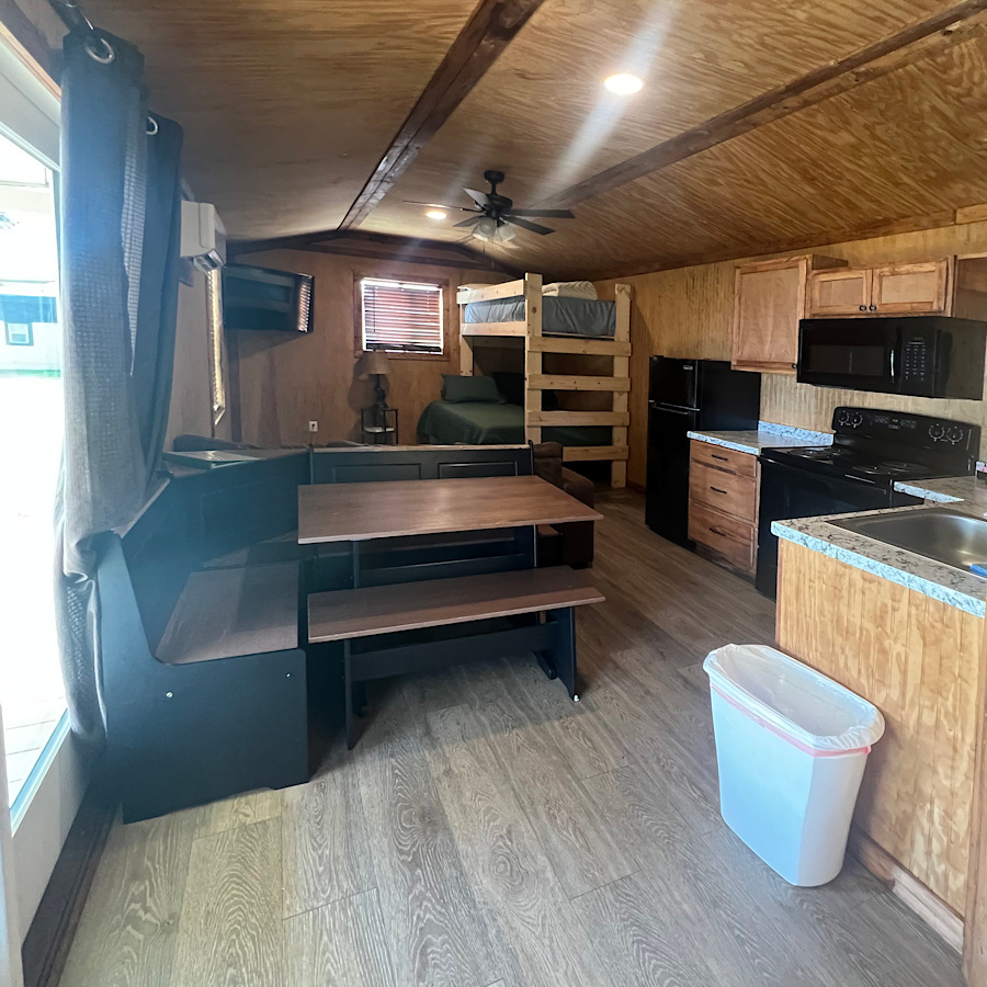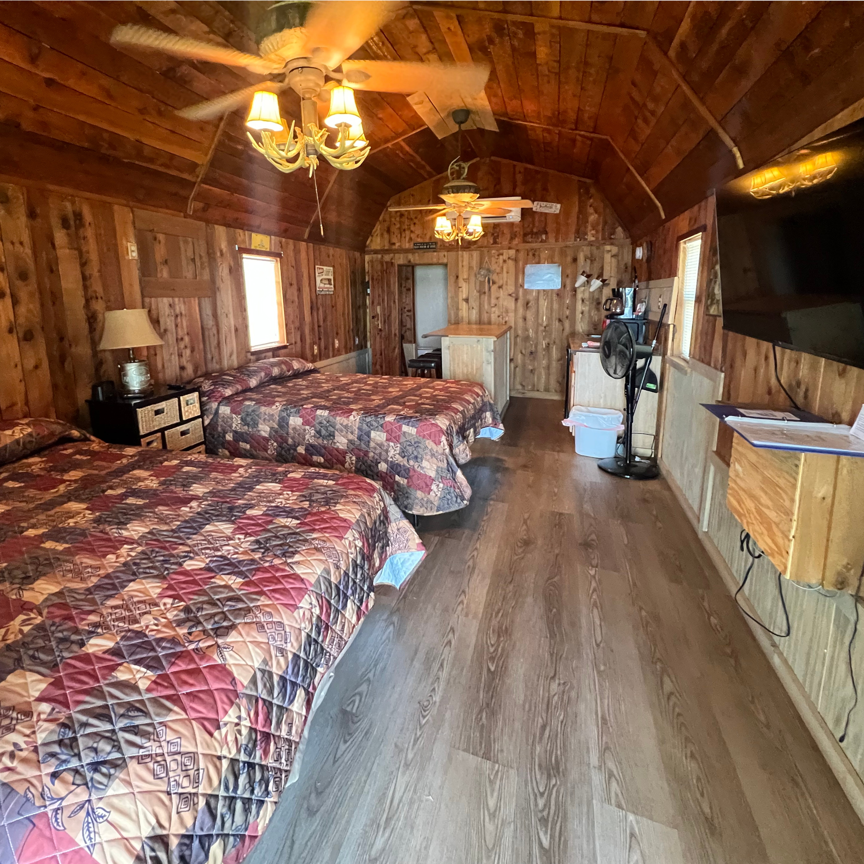 Check-In time for motel rooms and cabins is 3:00 pm and Check-out is 11:00 am. Pets are not allowed in our cabins, but in 5 of our motel rooms with $100.00 refundable deposit required and $25.00 non-refundable deposit per pet (1 large or 2 small).